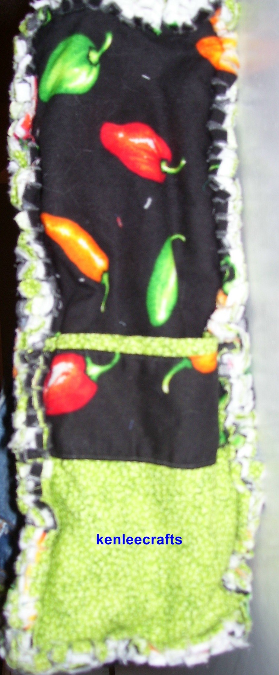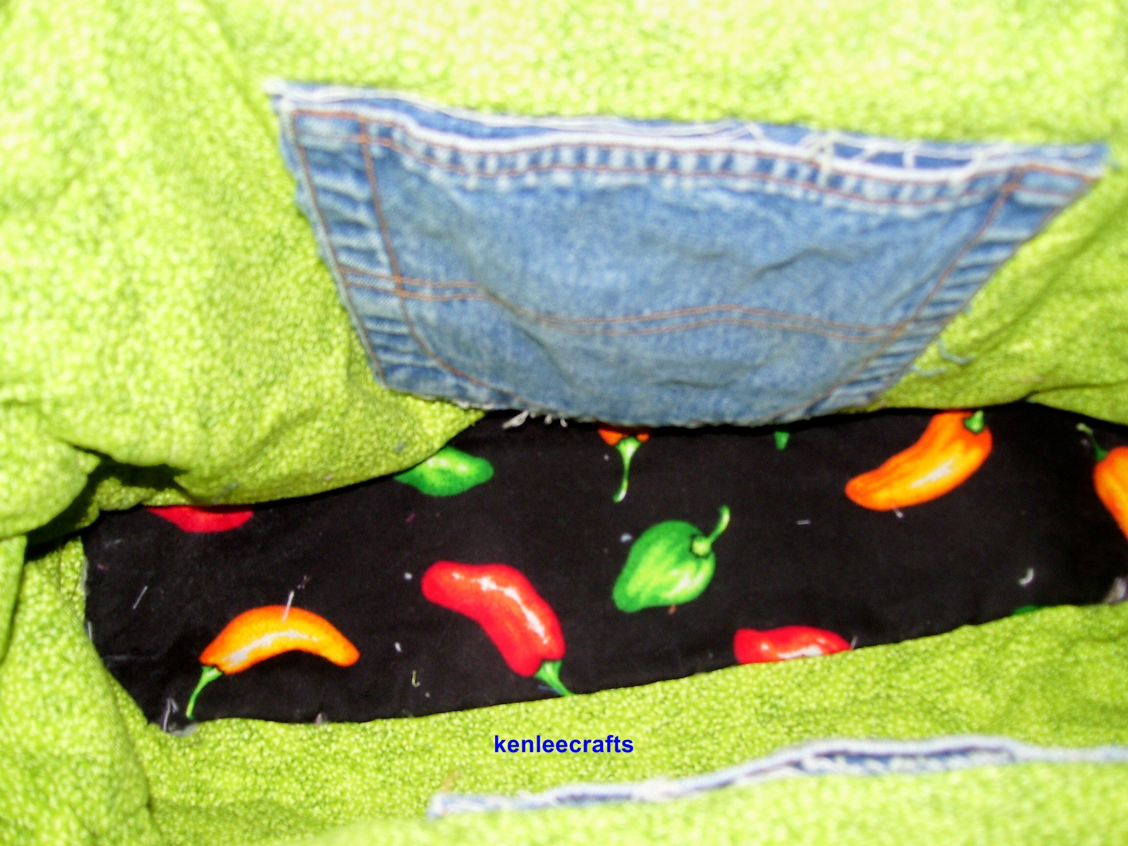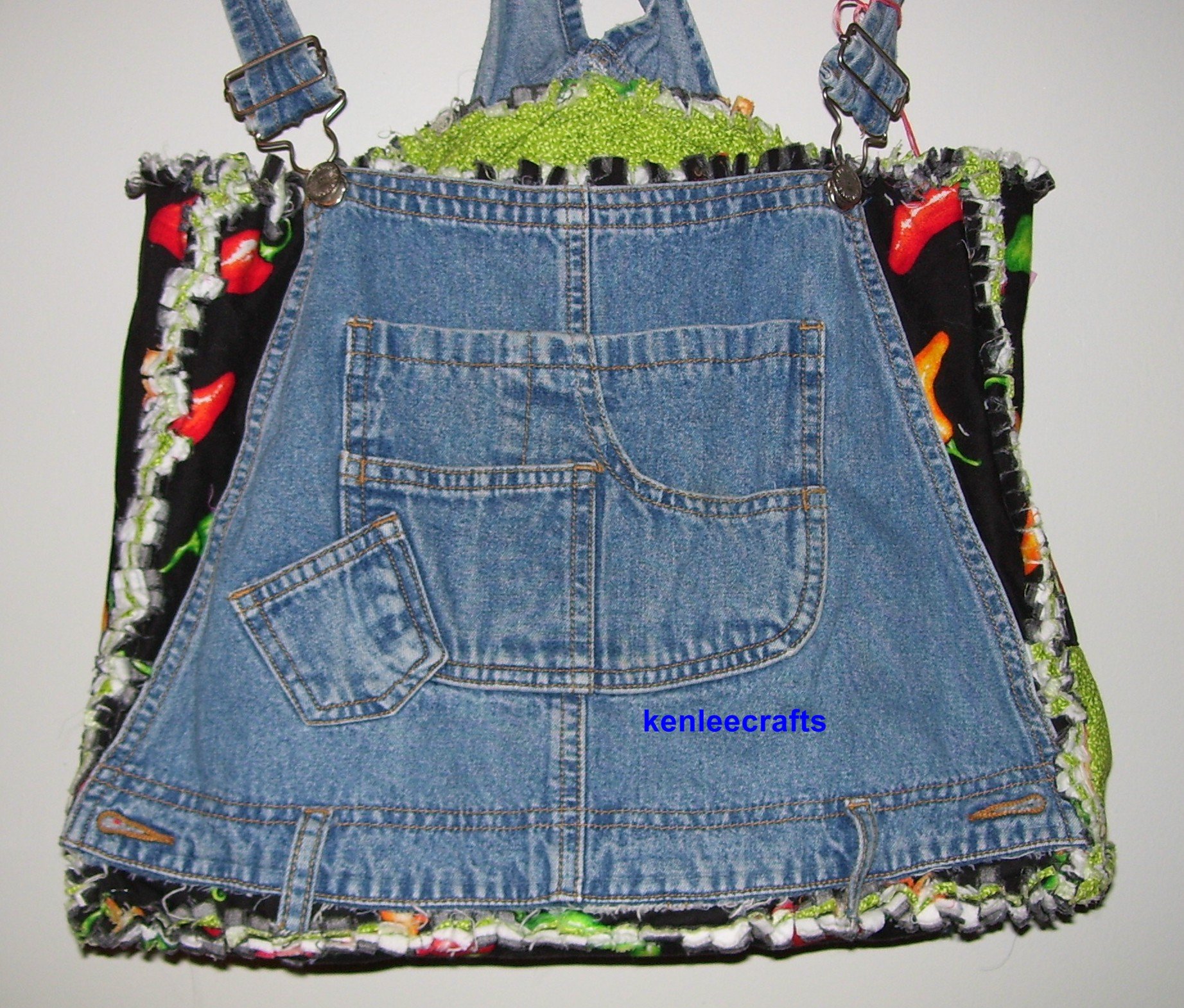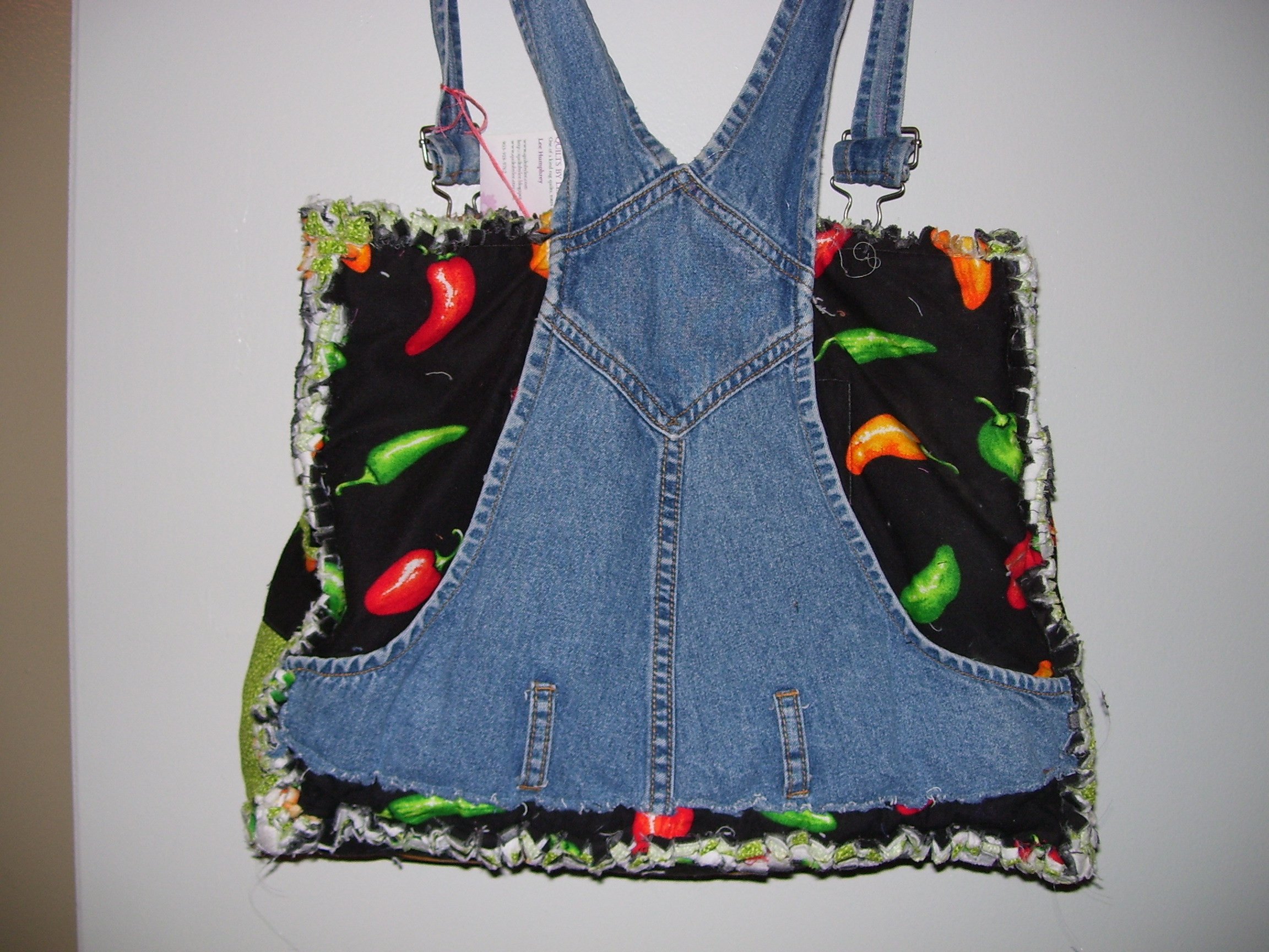 Tote is made with a recycled denim bib overalls, a chili pepper print cotton and a lime green cotton print.
