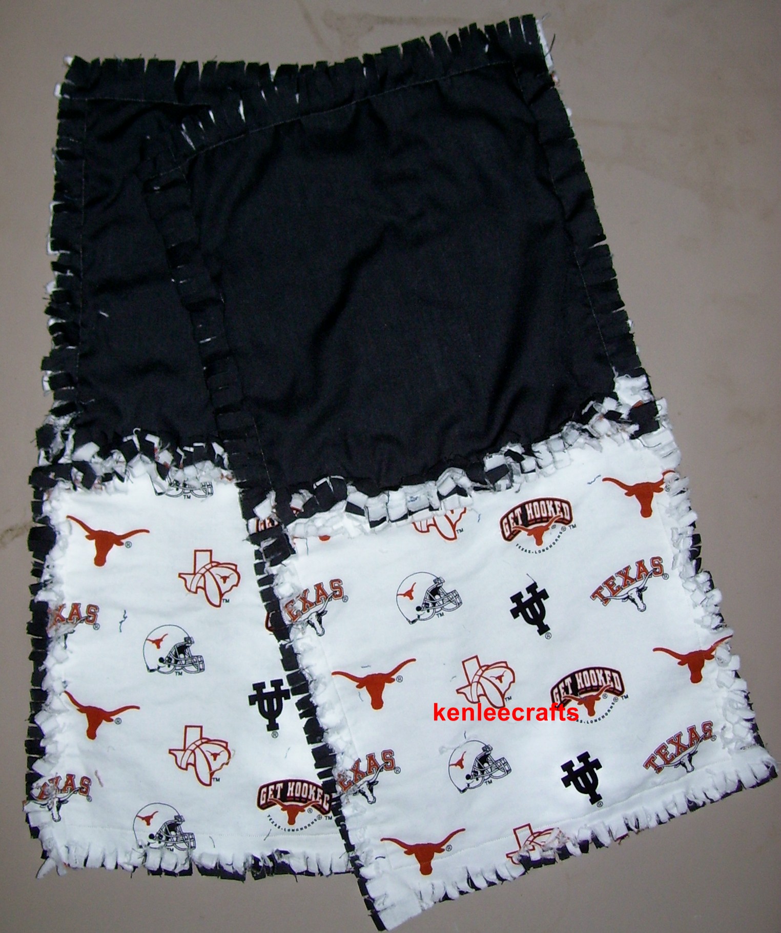 These two rag quilted burp cloths are made of squares of a Texas Longhorn cotton print and solid black cotton.