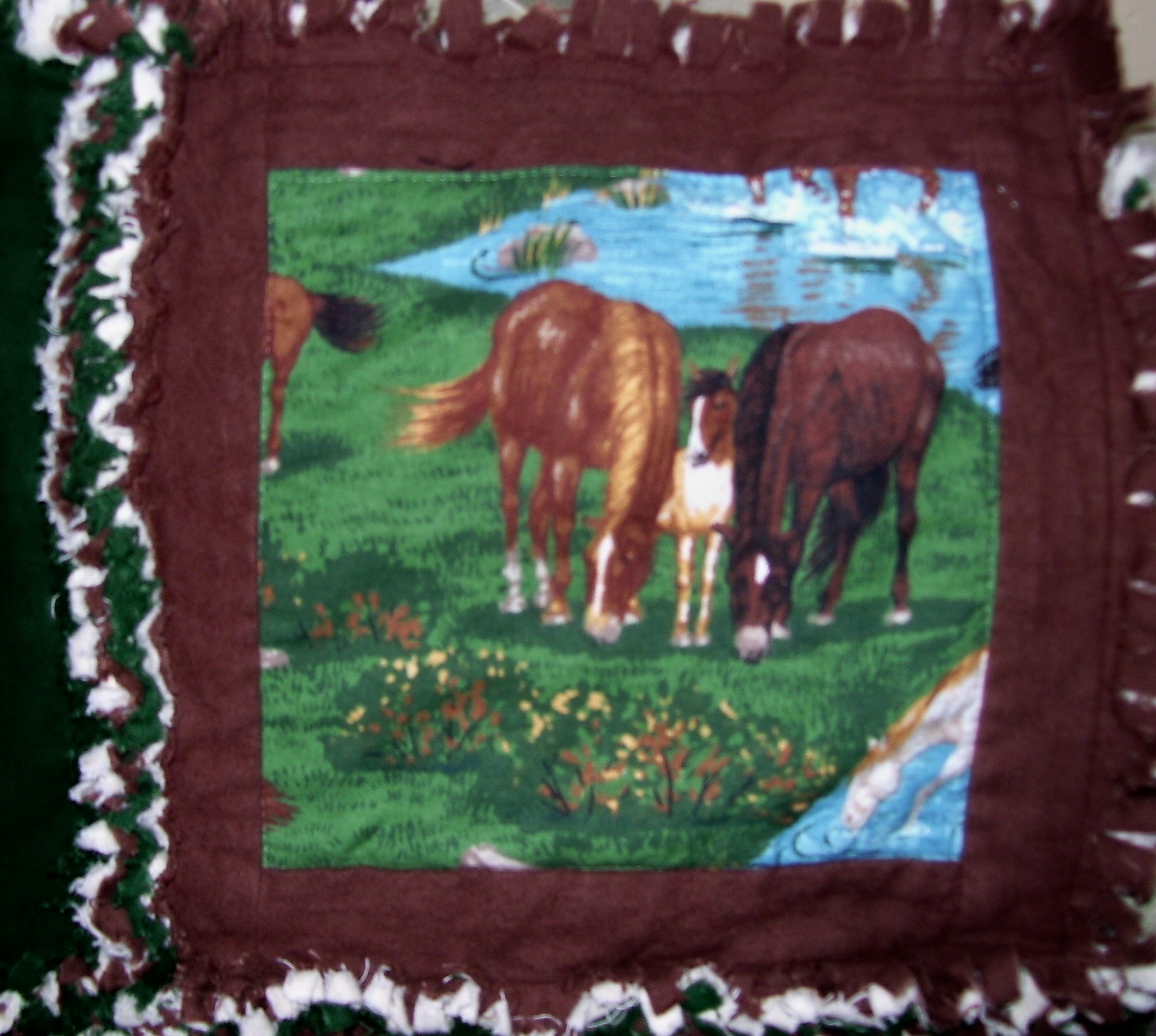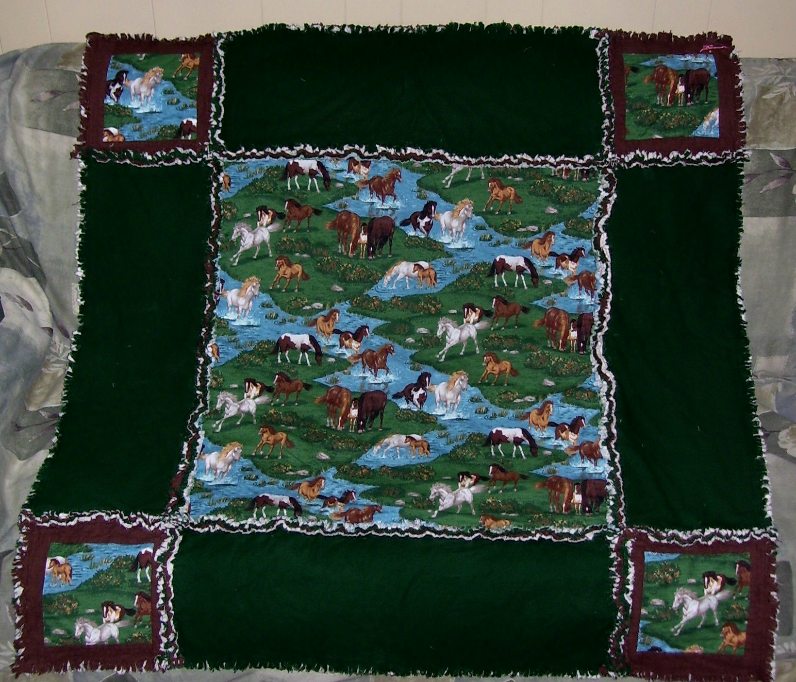 The quilt is made with a wild horses cotton print, a chocolate brown flannel and a dark green flannel.