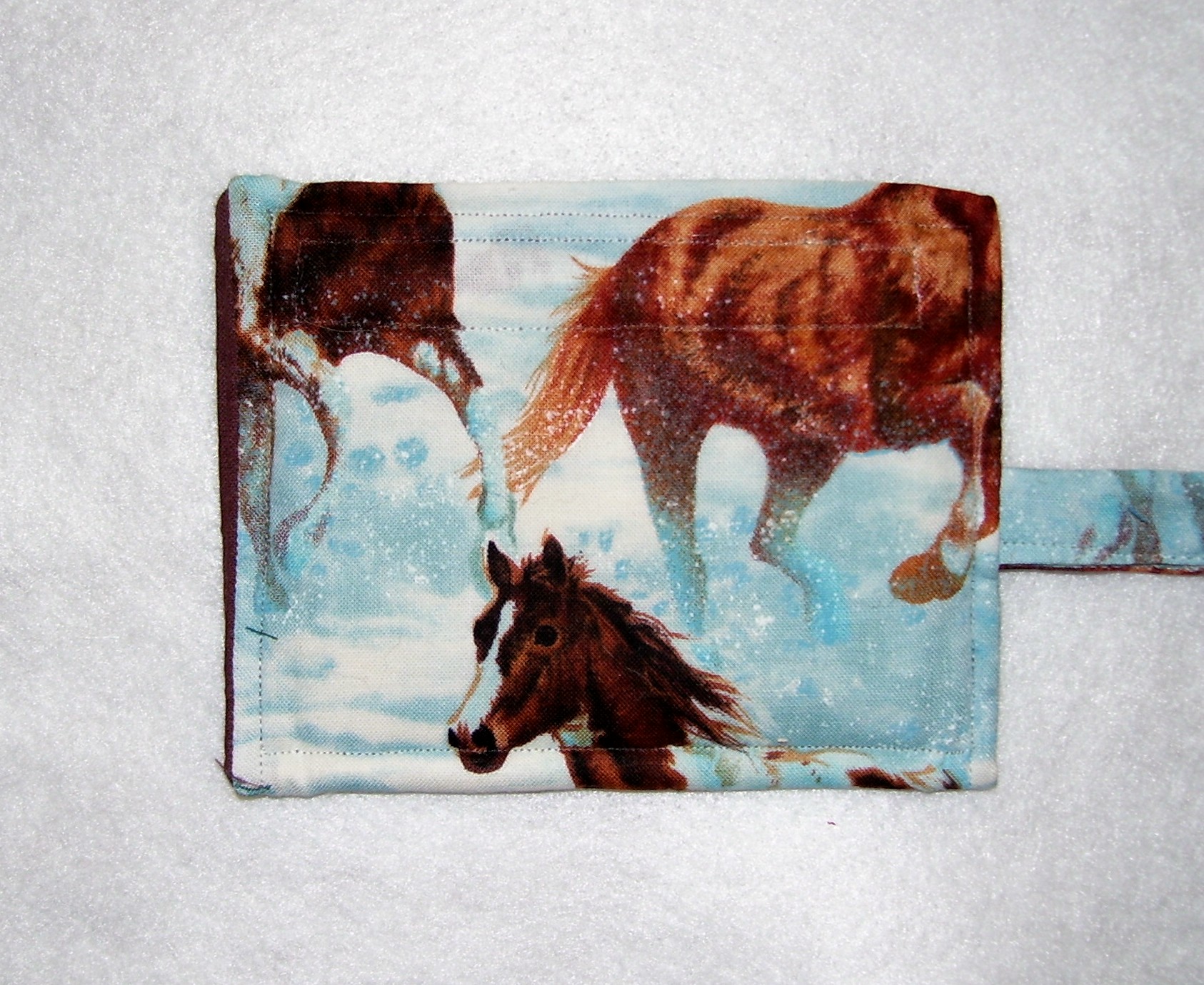 This is made with a wild horses cotton print and a chocolate brown on the inside. It has a velcro closure.