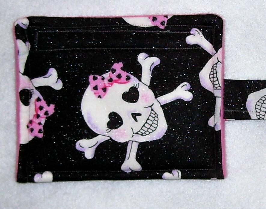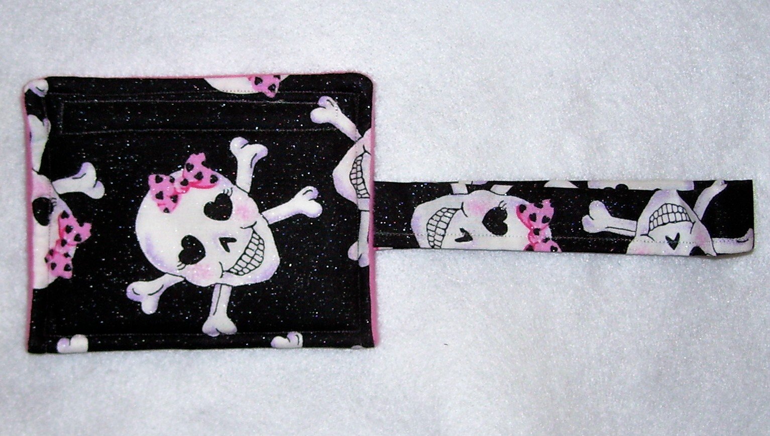 This is made with a skulls on black cotton print and a solid hot pink on the inside. It has a velcro closure.