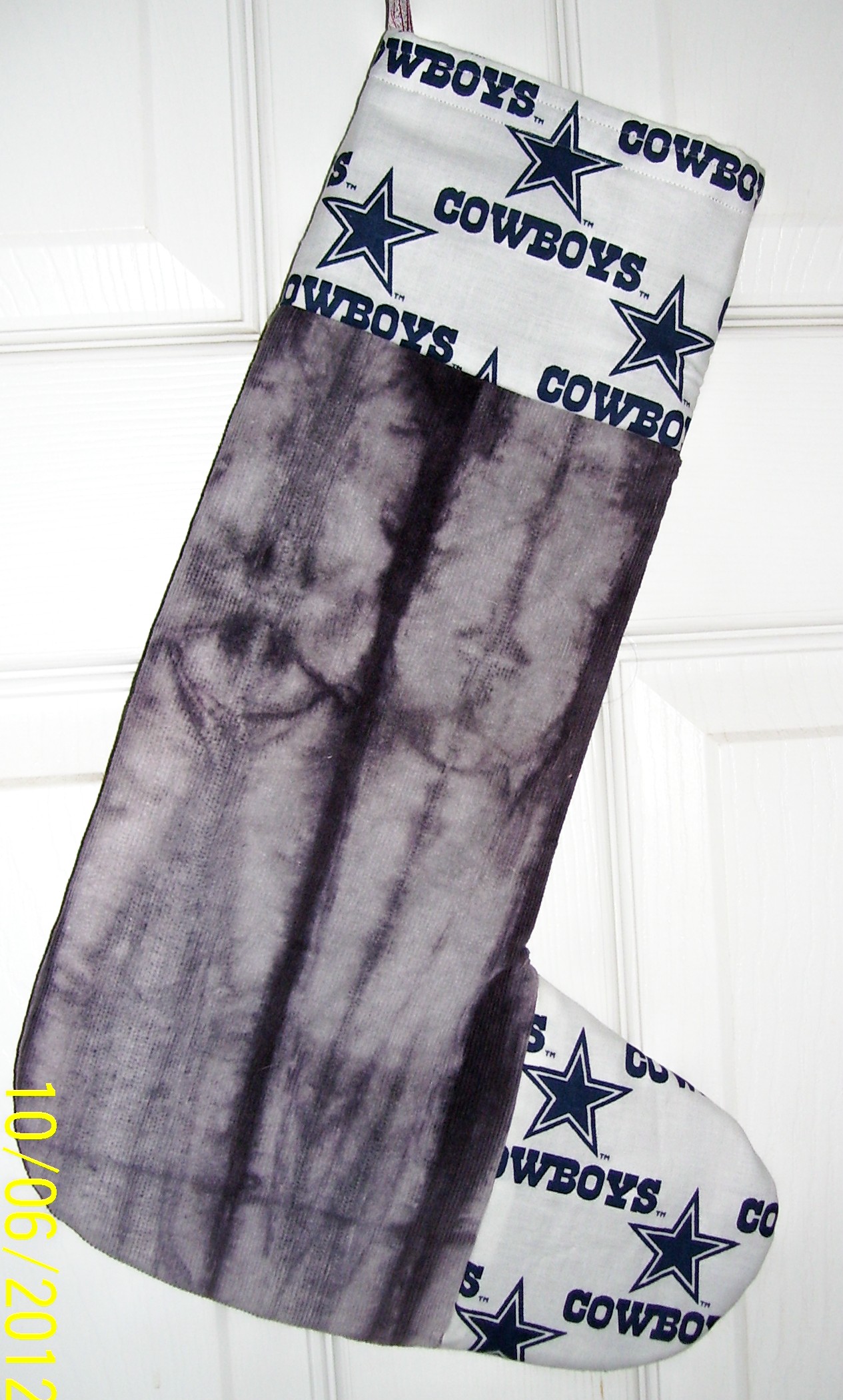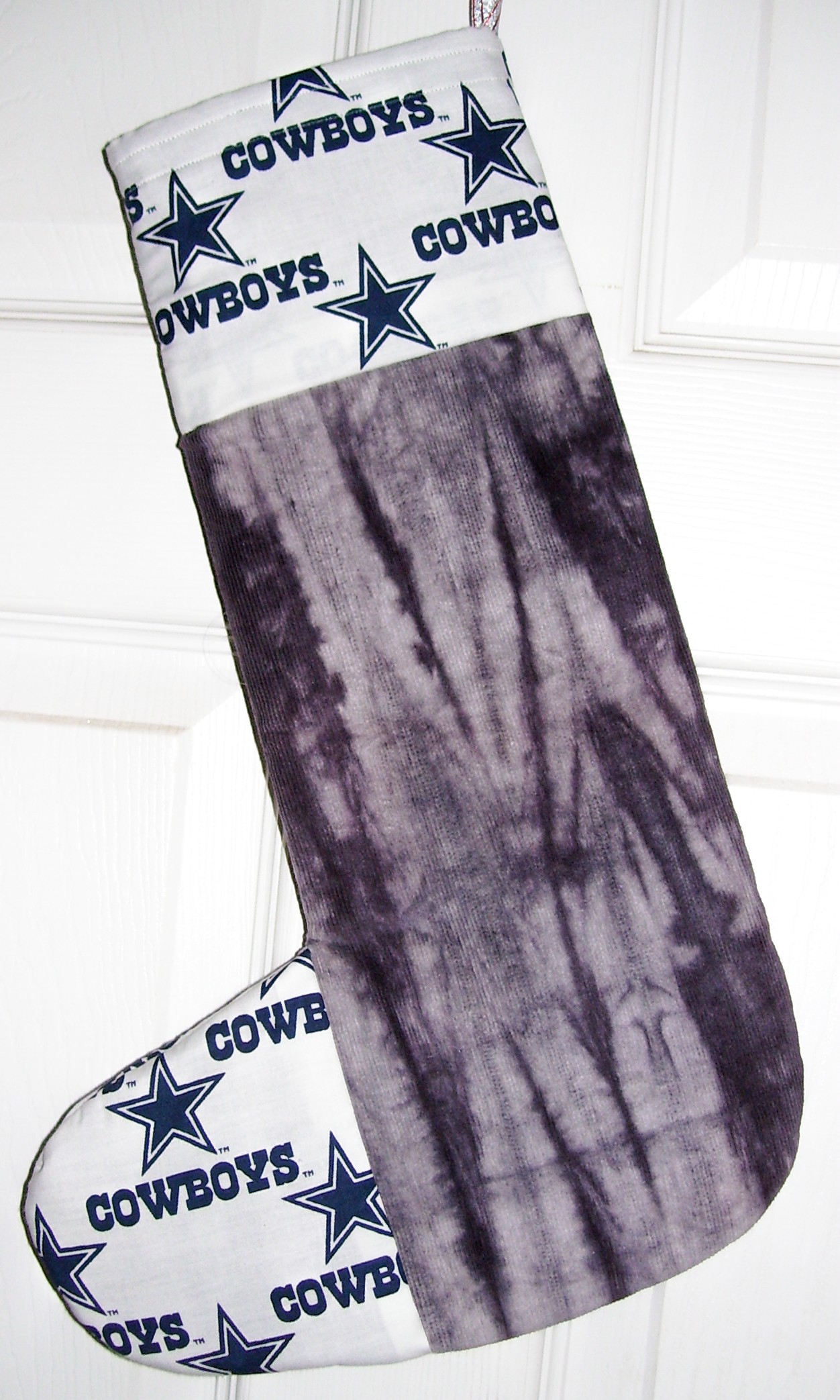 It is made with a Dallas Cowboys cotton print and a graduated gray corduroy.